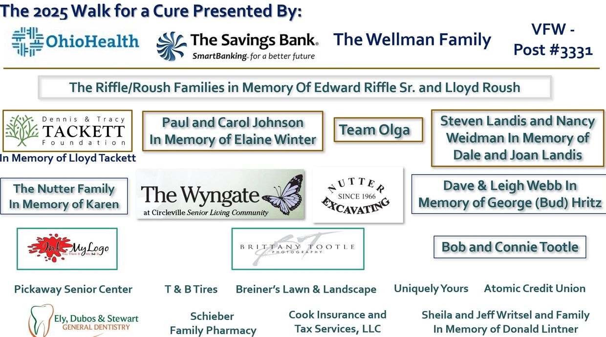The 2025 Parkinson’s Walk for a Cure was held at Mary Virginia Crites-Hannan Park on the last Saturday in April. The record-setting proceeds of this year’s walk and donations of approximately $28,900 will be divided equally between supporting the research in search of a cure (i.e., the national Parkinson Foundation) and continuing to assist local families experiencing PD (i.e., through the Parkinson fund managed by the Pickaway County Community foundation - PCCF).